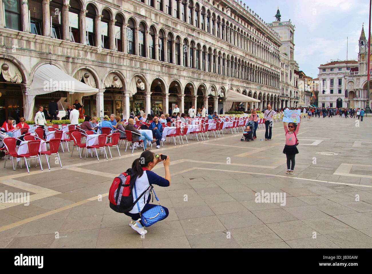 On piazza San Marco, Venice, Italy. A tourist is photographing her